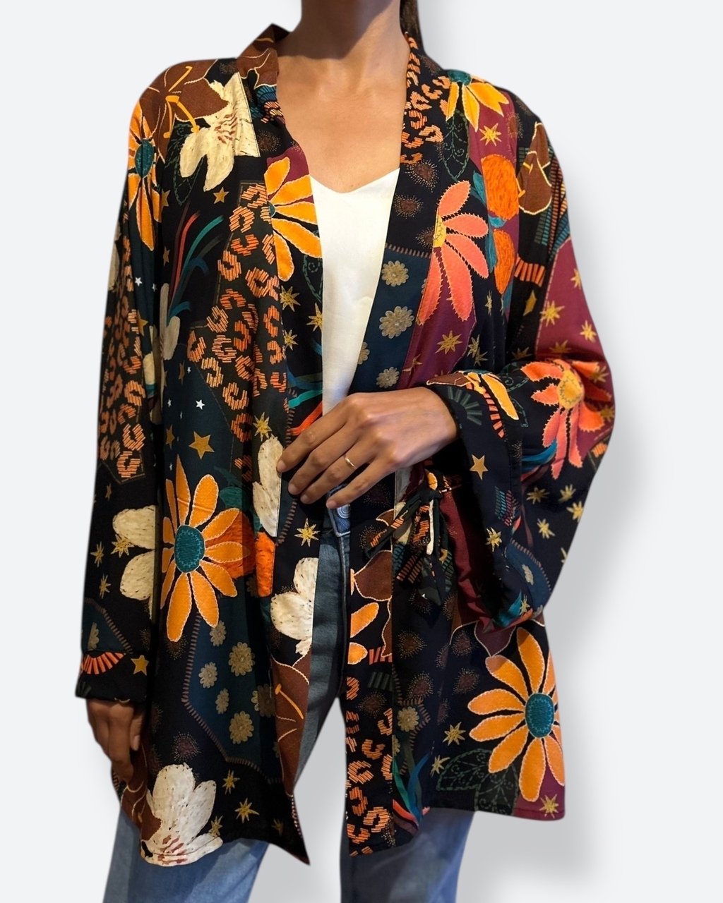 O Kimono manga longa em tecido 100% viscose, estamoa digital, é a escolha perfeita para quem busca conforto e estilo. Estampa com toque de cores , em fundo preto e desenhos em marrom, caramelo, turquesa, amarelo.